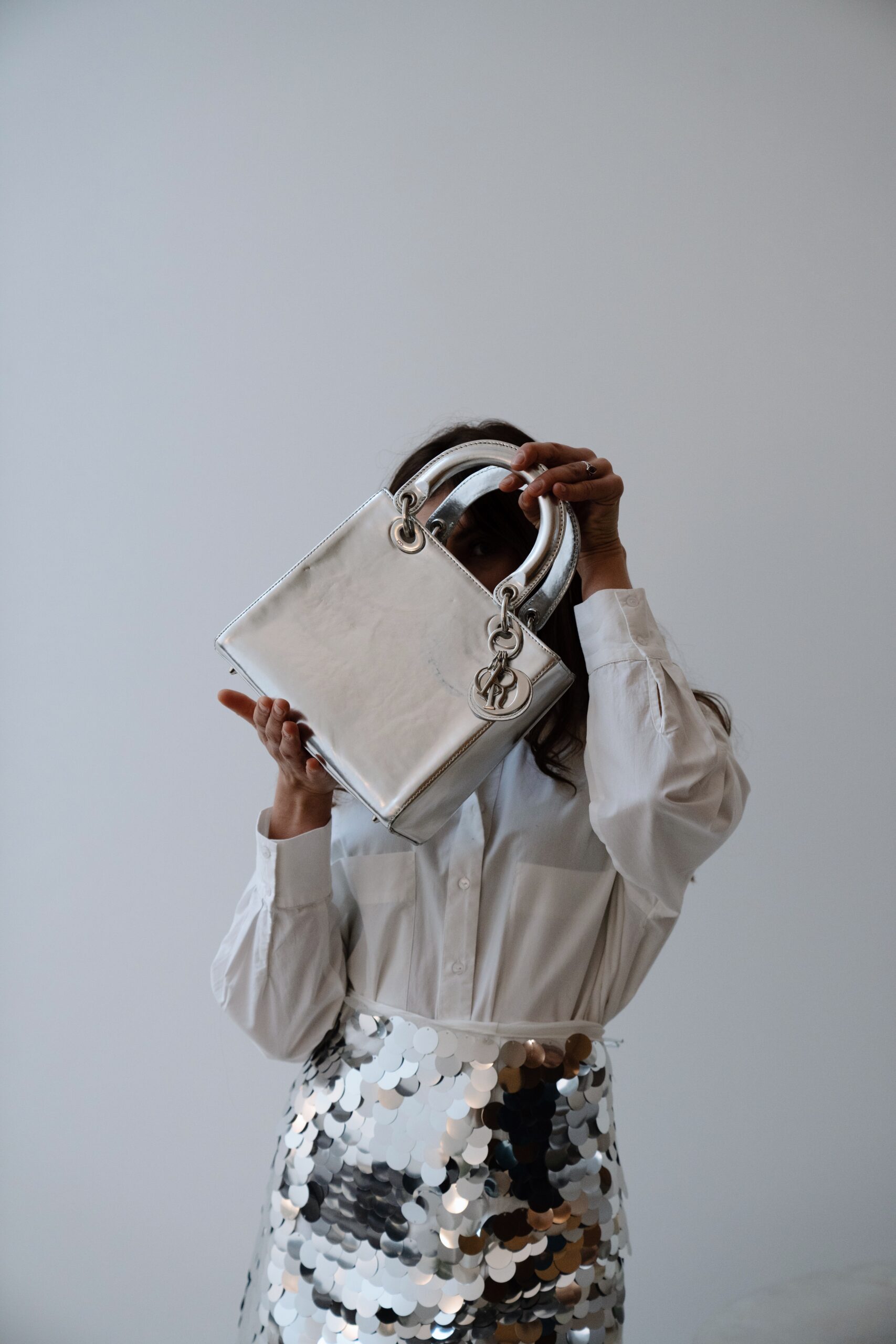 Deze prachtige tas van Dior, de Medium Lady Dior in metallic zilver kalfsleer komt uit de collectie van 2013. Het is echt een eyecatcher en deze Dior e tas is gemaakt van glad metallic zilver kalfsleer en heeft leren handgrepen aan de bovenkant met gepolijste zilveren schakels, een zilveren Dior-bedeltje en een optionele leren schouderriem.
