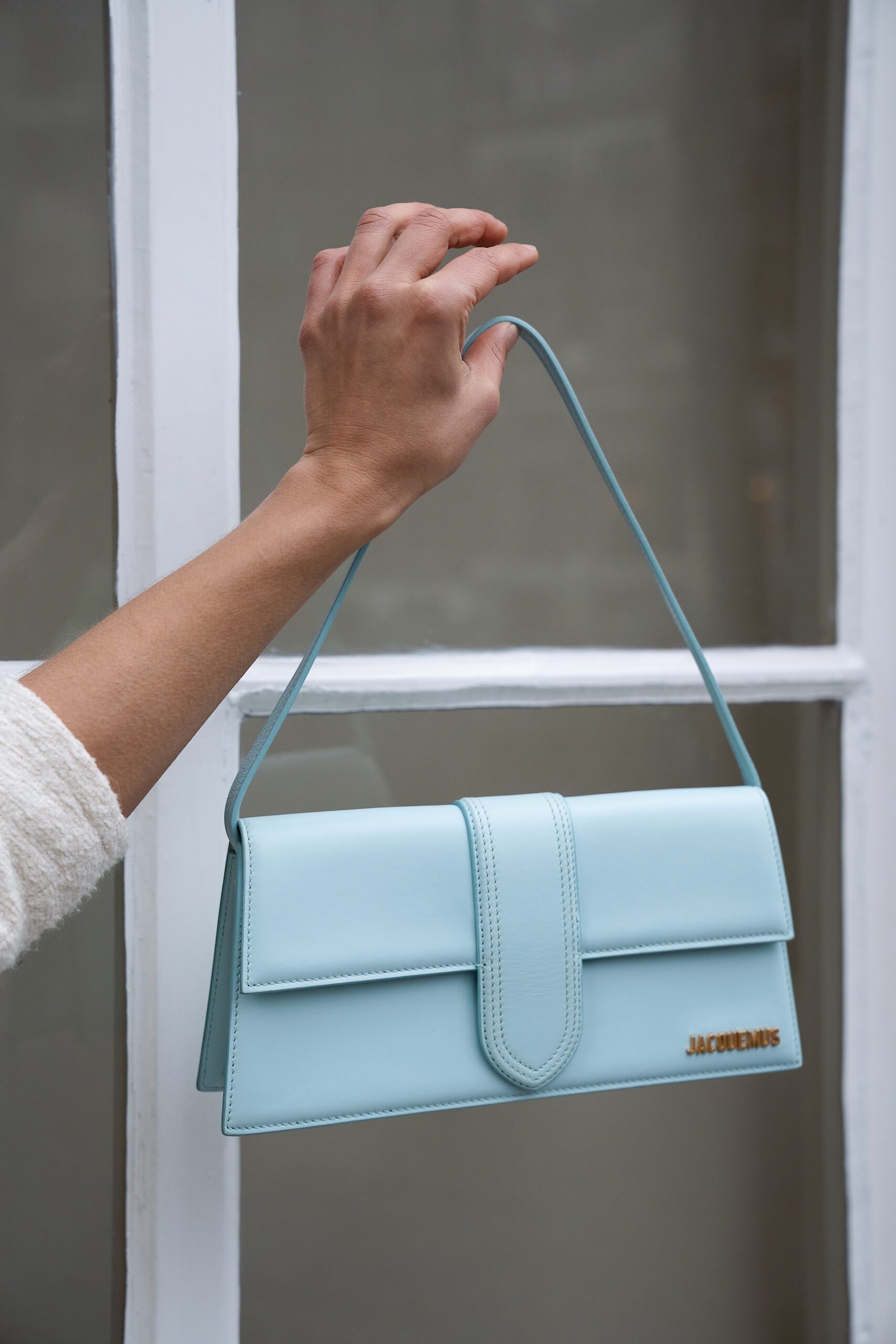Dit is dé populairste Jacquemus schoudertas van dit seizoen, de long bambino tas in babyblauw. Deze heerlijke kleur maakt iedere outfit af. Perfect voor wedding seizoen en de zomerse cocktailparty’s. Je kunt ook de Jacquemus bambino schoudertas ook huren in een beige bouclé stof.