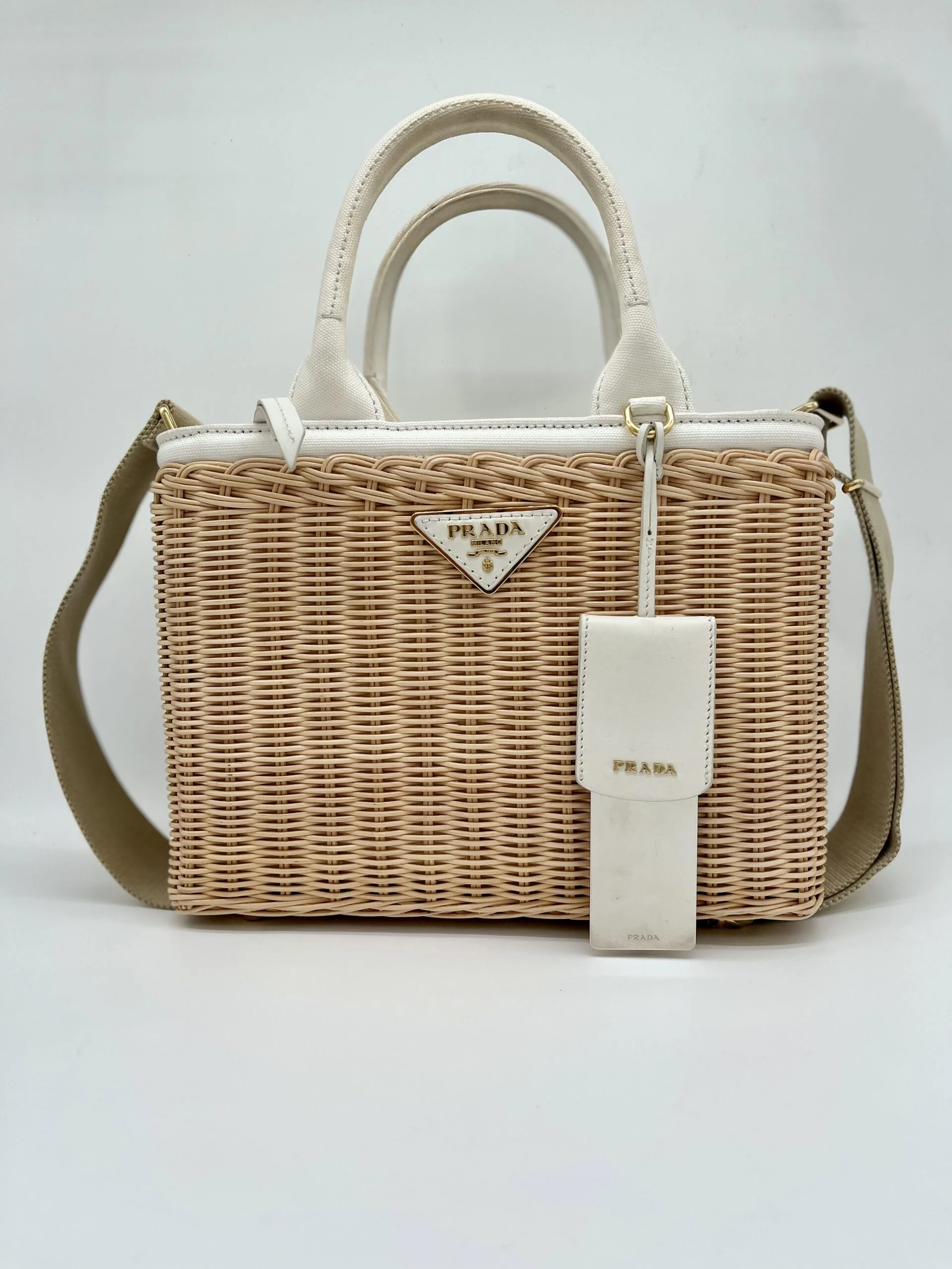 Zomer in een tas, dat is de Prada Wicker rieten basket tas met crossbody strap. Heb jij nog zonnige tripjes op de planning? Deze Prada Wicker rieten tas heeft het ideale formaat voor overdag en de avond. Door de verstelbare crossbody riem kun je de tas op verschillende manieren en lengtes dragen. Het rieten design met het iconische Prada logo in goud maakt deze tas een echte eyecatcher. Bekijk de tas op de Prada site.
