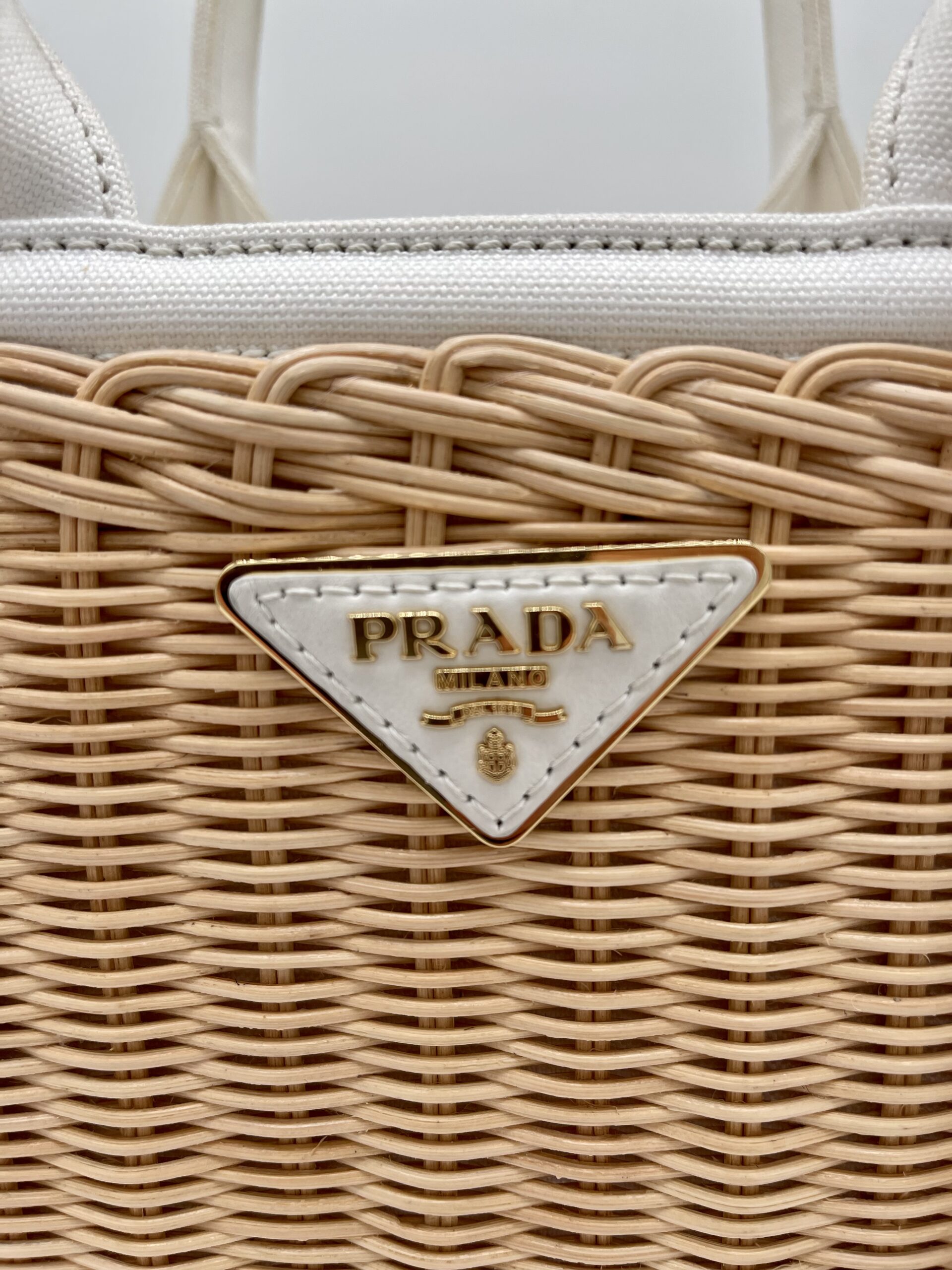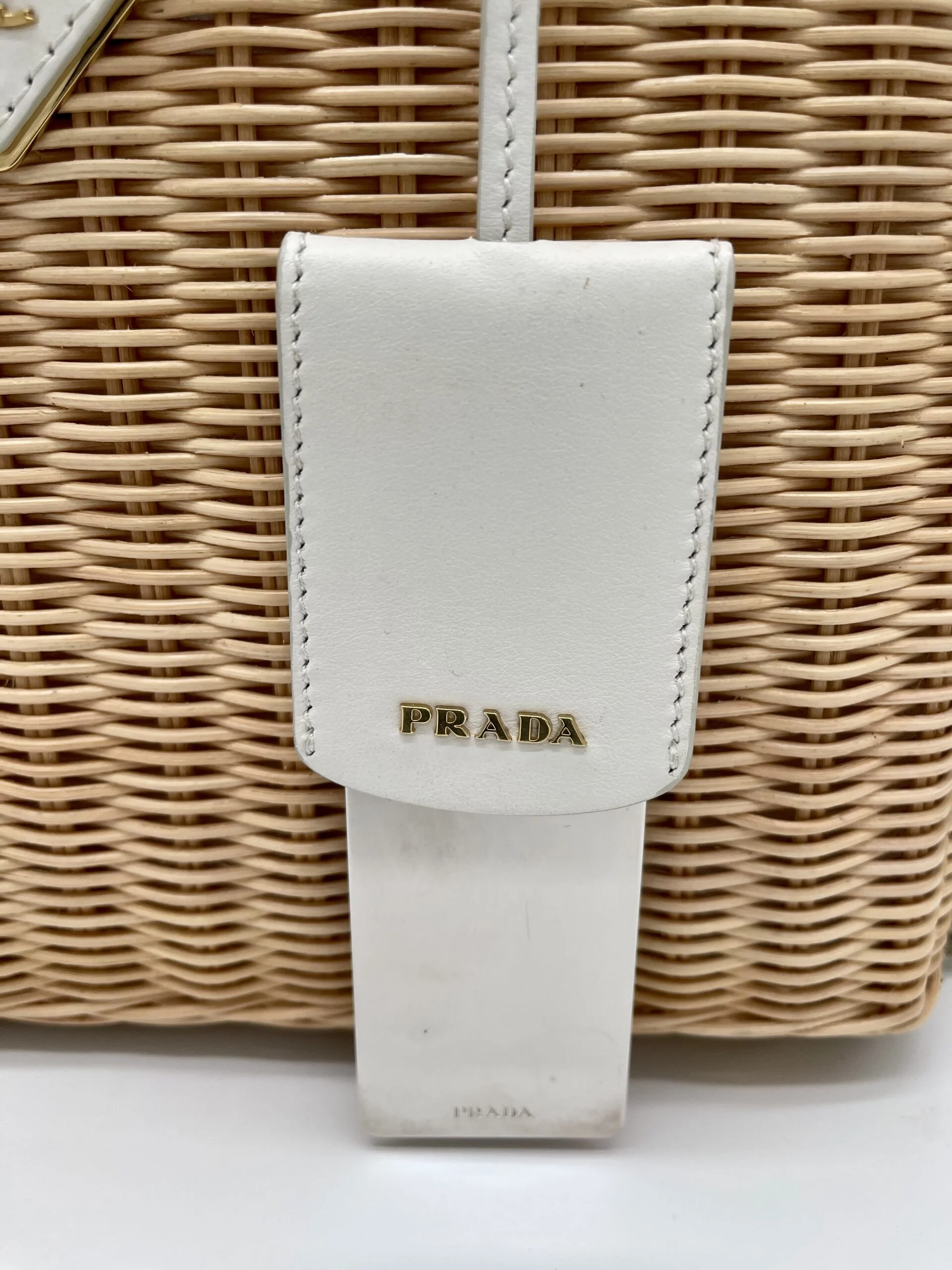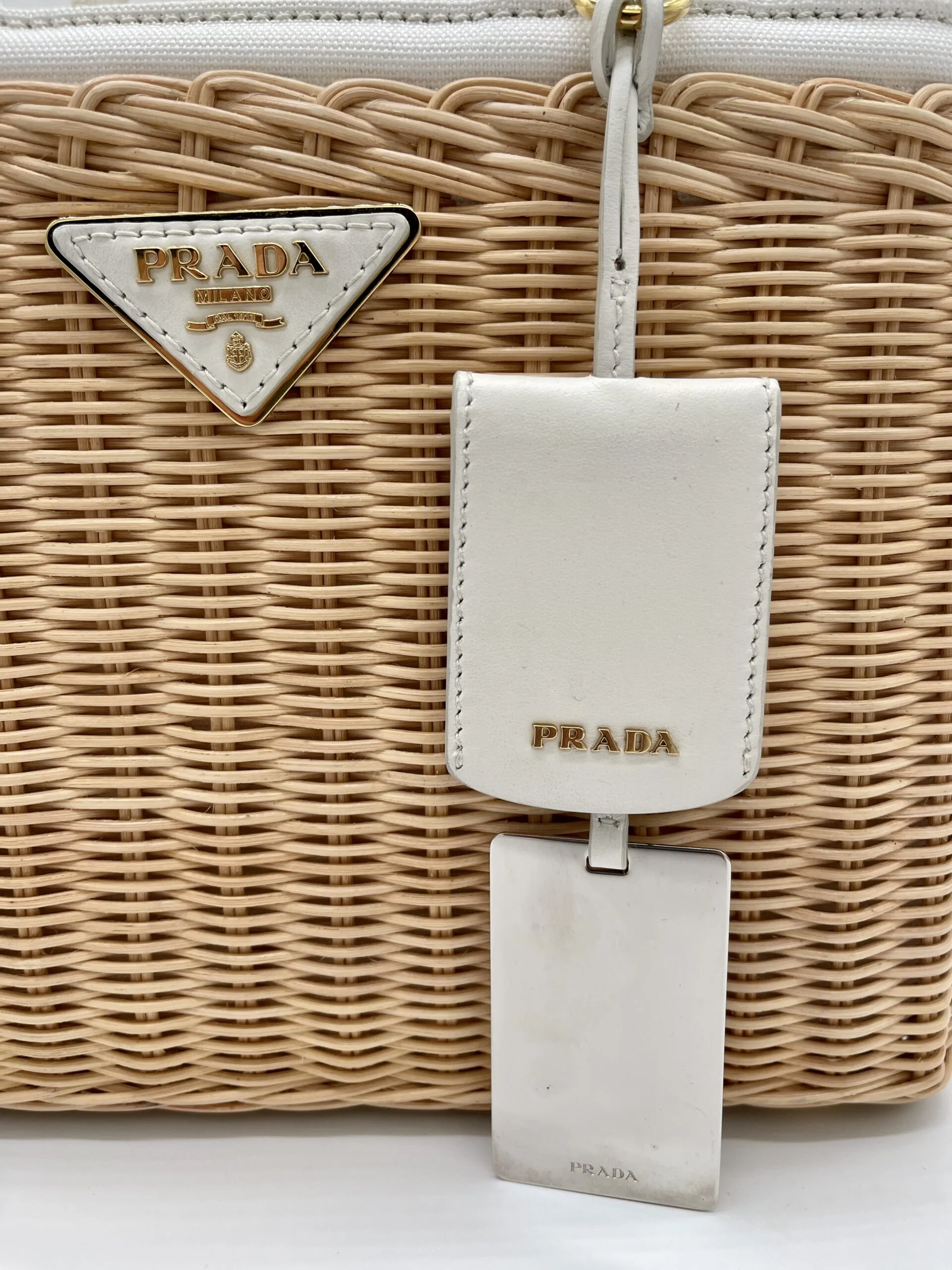 De Prada basket tas is in redelijk goede gebruikte staat, het gevlochten riet heeft geen beschadigingen. De witte handvaten zijn verkleurd en de voering van de tas heeft wat vlekjes.
