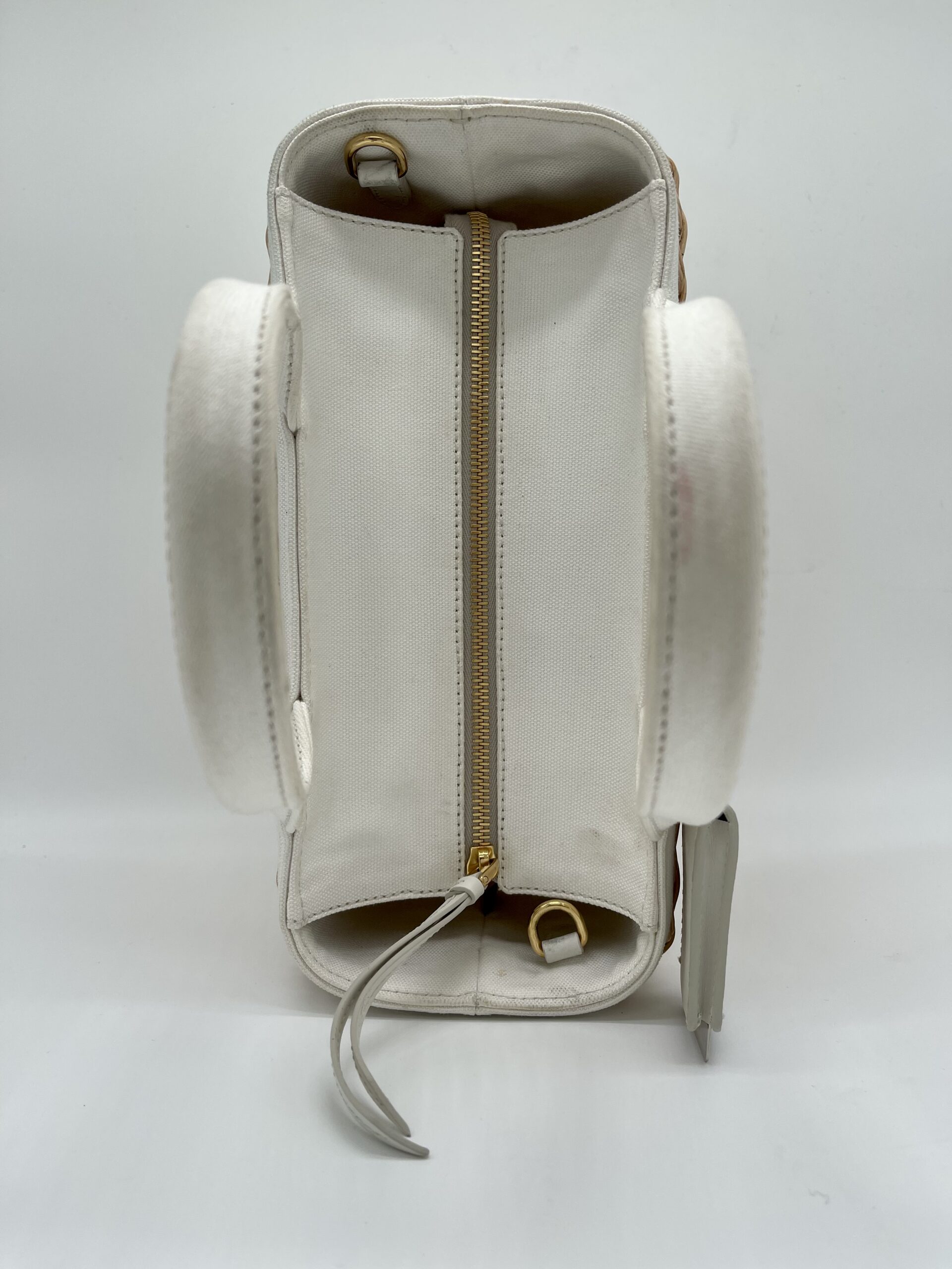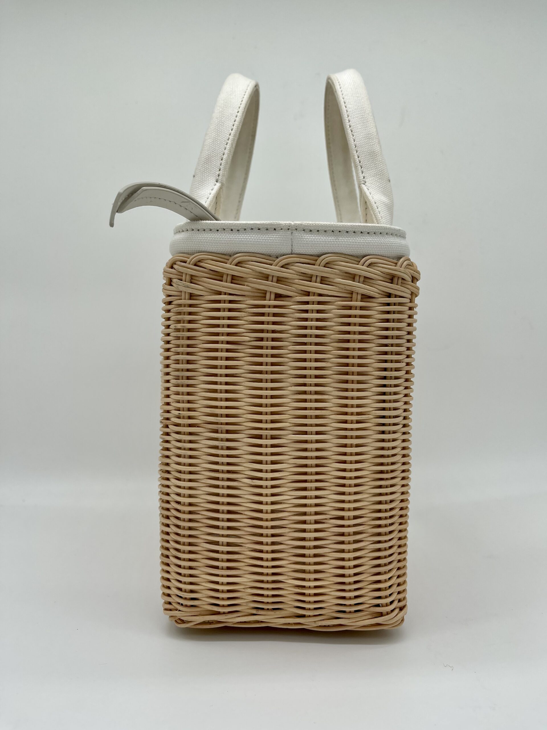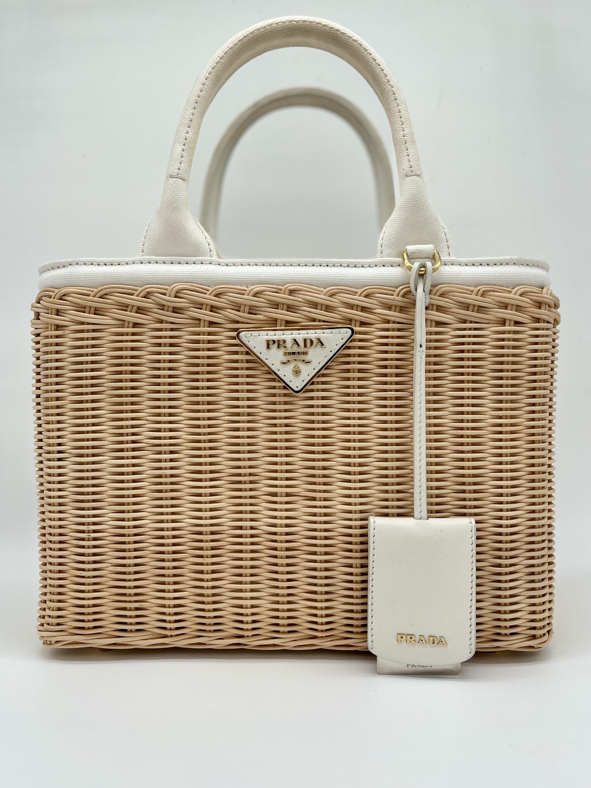 De Prada basket tas is in redelijk goede gebruikte staat, het gevlochten riet heeft geen beschadigingen. De witte handvaten zijn verkleurd en de voering van de tas heeft wat vlekjes.